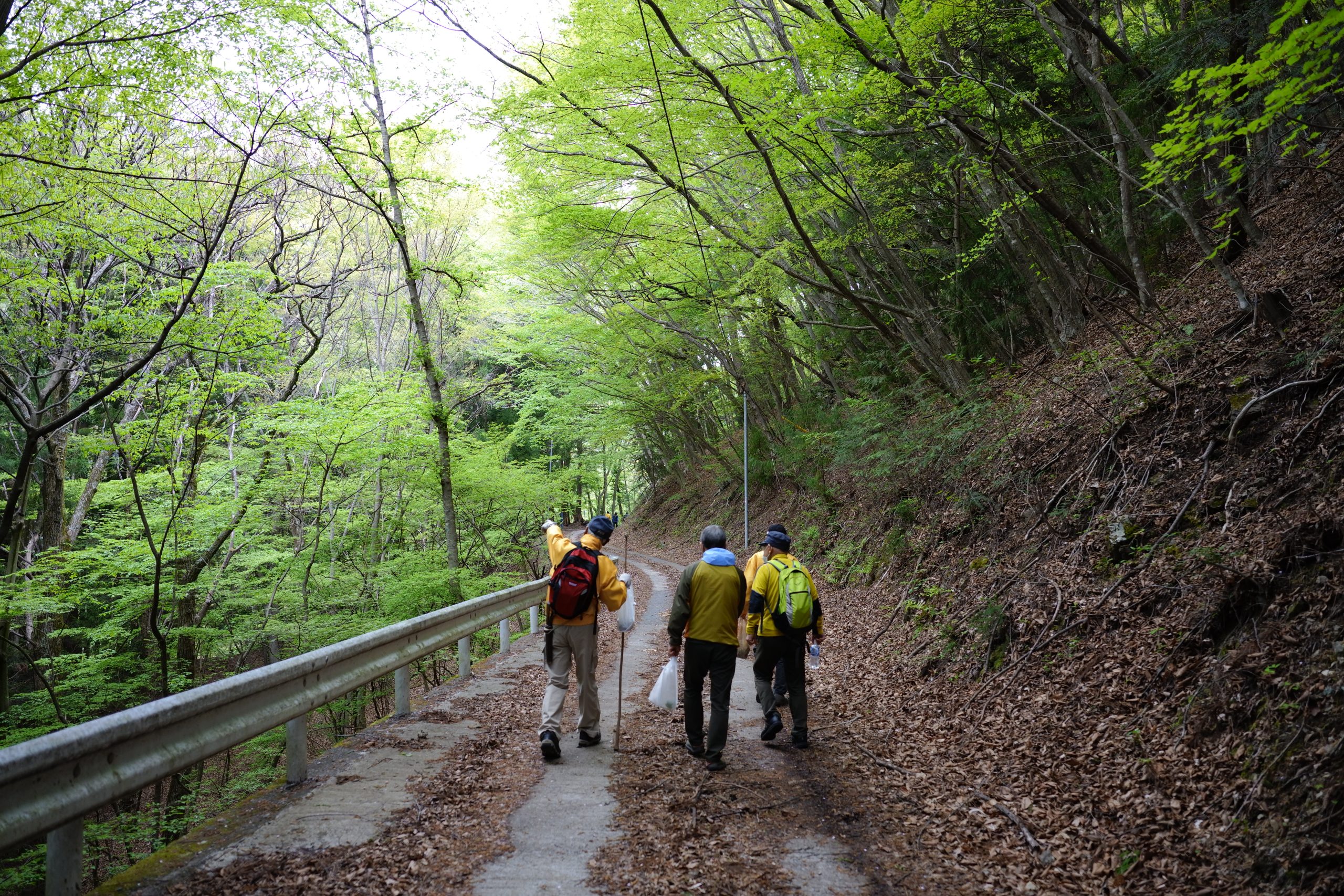 会員の皆さんやサポーターの方々で安全祈願を行い、林道有沢針間野線へ山菜取りに入りました。
